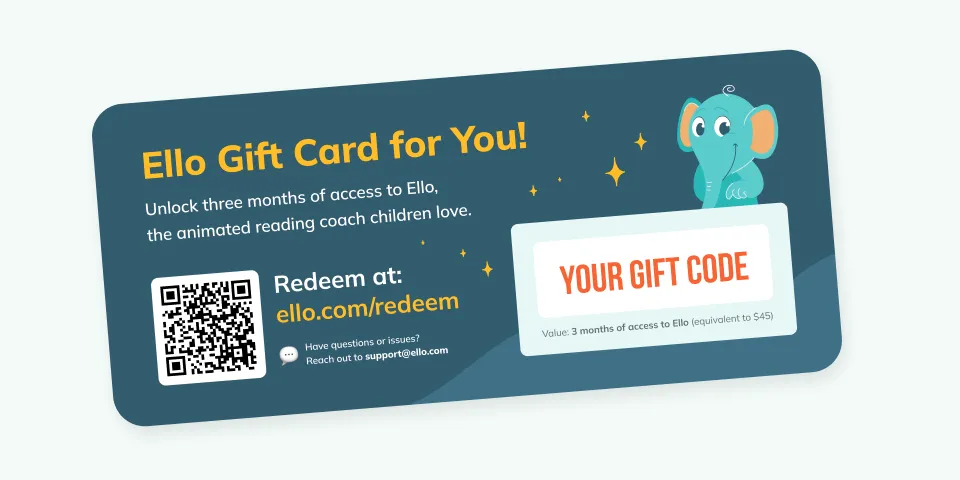 Each Gift Box will come with a physical gift card inside. Gift receivers will redeem their gift card via a special website (link to come) for three months off of an Ello with E-books monthly subscription. They will not only receive access to Ello’s coaching for the full library of over 800 decodable books, but also for the five physical books in their box!